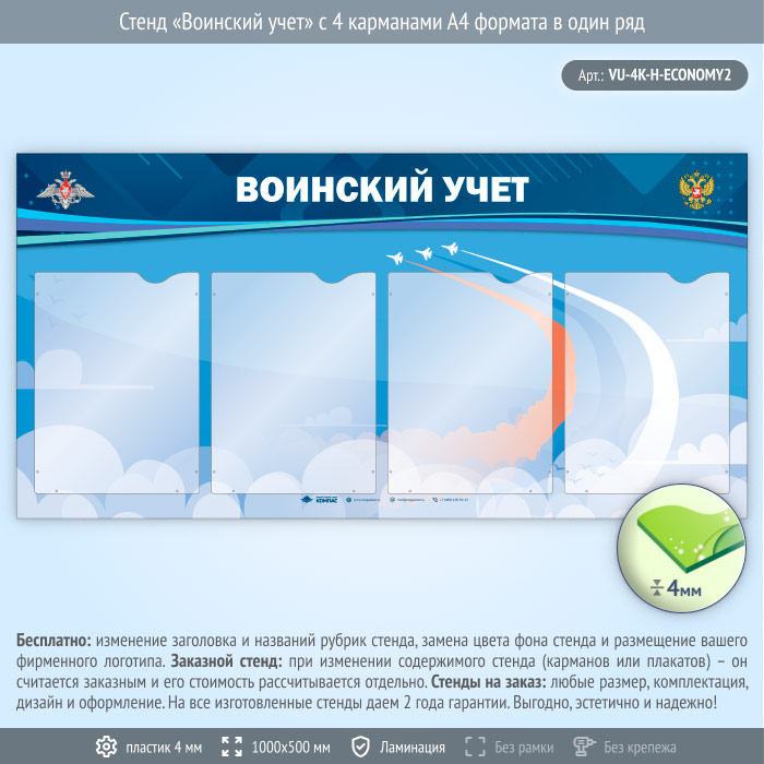 Стенд «Воинский учет» с 4 карманами А4 формата в один ряд (VU-4K-H-ECONOMY2) в Альметьевске купить