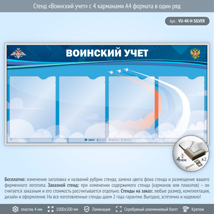 Стенд «Воинский учет» с 4 карманами А4 формата в один ряд (VU-4K-H-SILVER) в Альметьевске купить