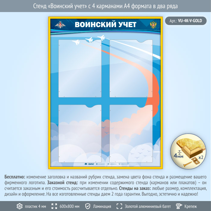 Стенд «Воинский учет» с 4 карманами А4 формата в два ряда (VU-4K-V-GOLD) в Альметьевске купить