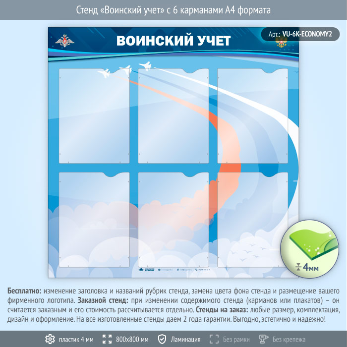 Стенд «Воинский учет» с 6 карманами А4 формата (VU-6K-ECONOMY2) в Альметьевске купить