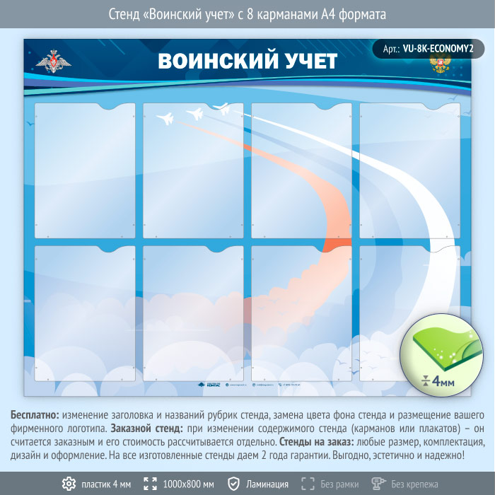 Стенд «Воинский учет» с 8 карманами А4 формата (VU-8K-ECONOMY2) в Альметьевске купить