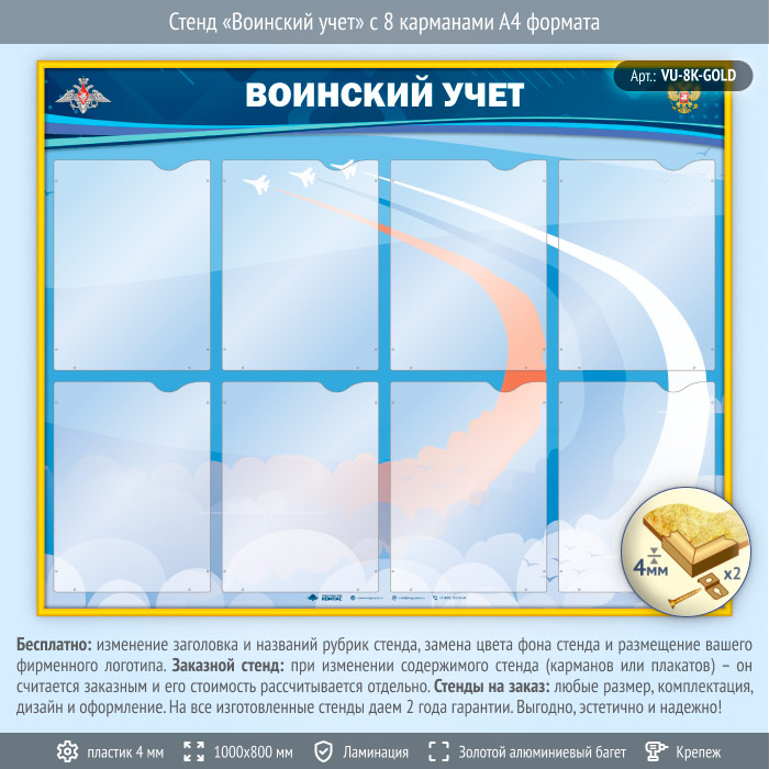 Стенд «Воинский учет» с 8 карманами А4 формата (VU-8K-GOLD) в Альметьевске купить