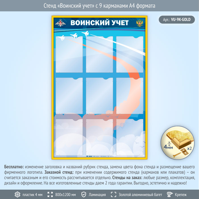 Стенд «Воинский учет» с 9 карманами А4 формата (VU-9K-GOLD) в Альметьевске купить