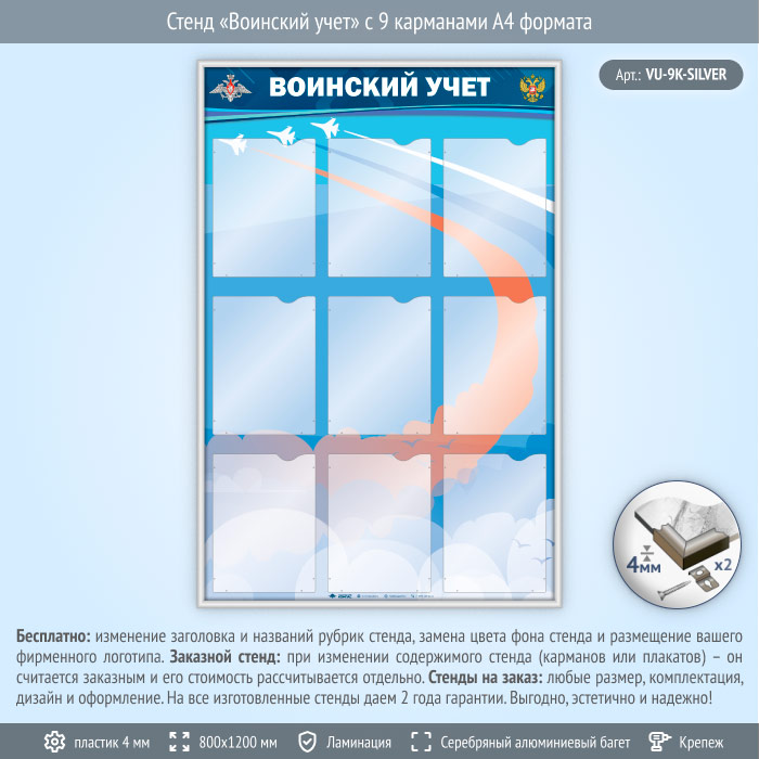 Стенд «Воинский учет» с 9 карманами А4 формата (VU-9K-SILVER) в Альметьевске купить