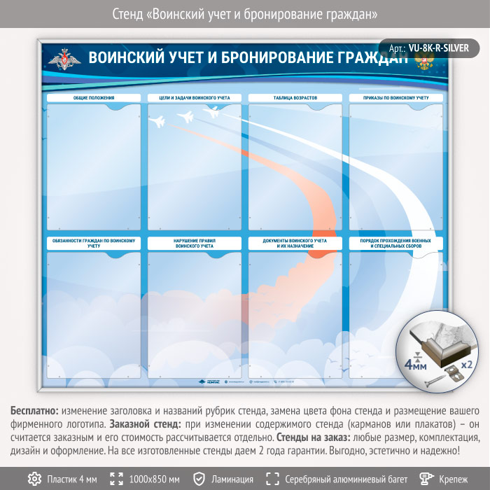 Стенд «Воинский учет и бронирование граждан» с 8 карманами А4 формата (VU-8K-R-SILVER) в Альметьевске купить