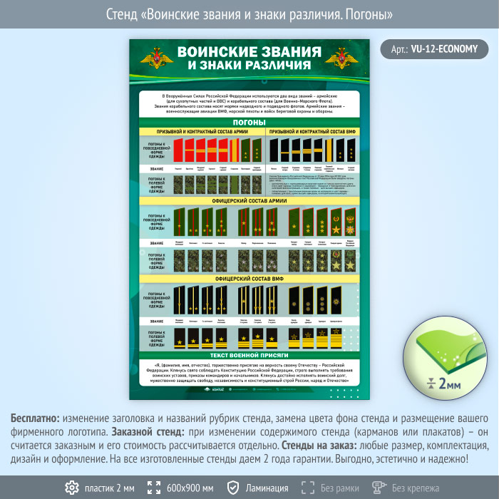 Стенд «Воинские звания и знаки различия. Погоны» (VU-12-ECONOMY) в Альметьевске купить