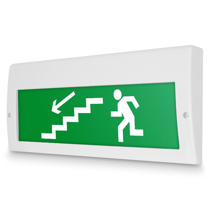 Световое табло «Направление к эвакуационному выходу по лестнице вниз (левосторонний)», Молния (220В РИП) в Альметьевске купить