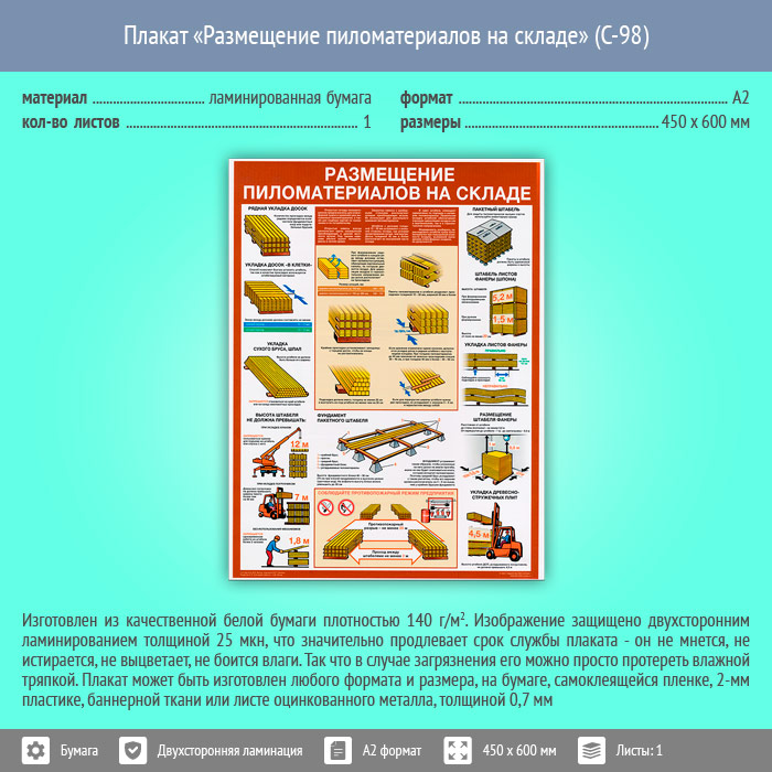 Плакат «Размещение пиломатериалов на складе» (С-98, ламинированная бумага, А2, 1 лист) в Альметьевске купить