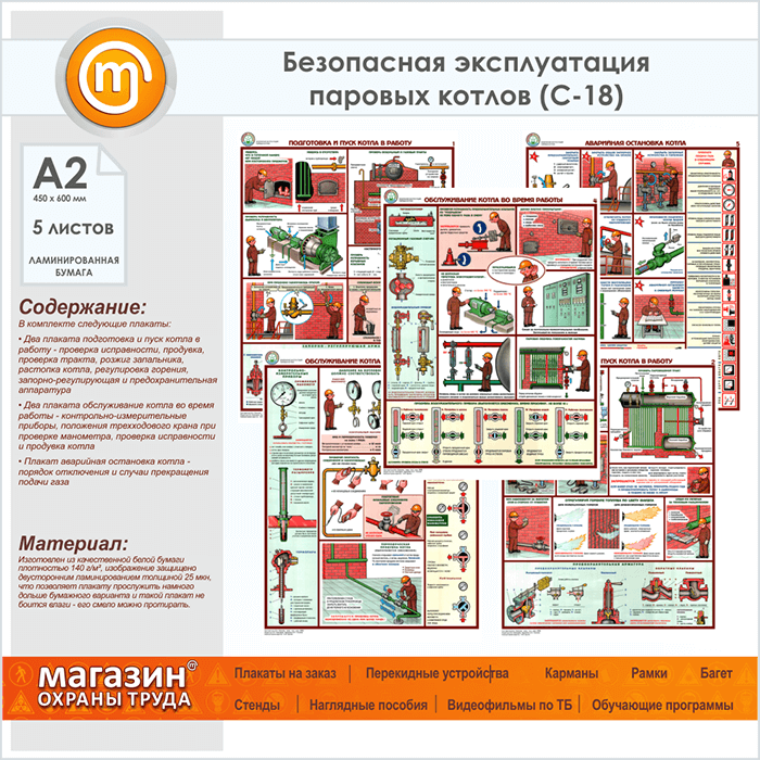 Плакаты «Безопасная эксплуатация паровых котлов» (С-18, ламинированная бумага, А2, 5 листов) в Альметьевске купить
