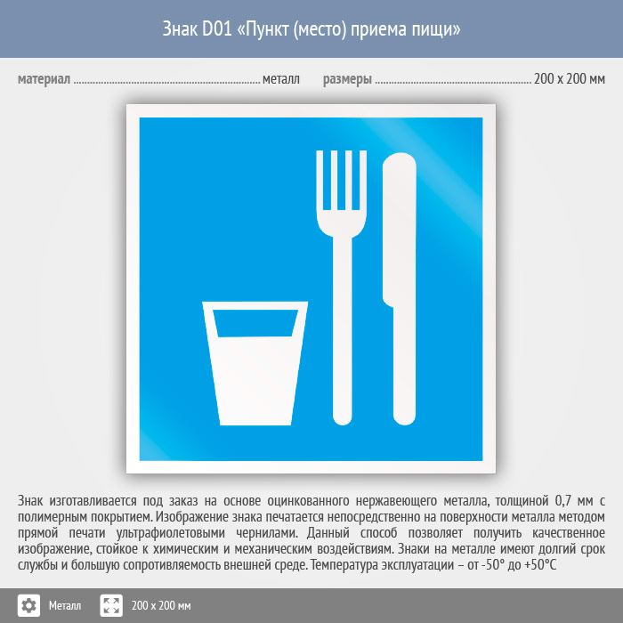 Знак D01 «Пункт (место) приема пищи» (металл, 200х200 мм) в Альметьевске купить