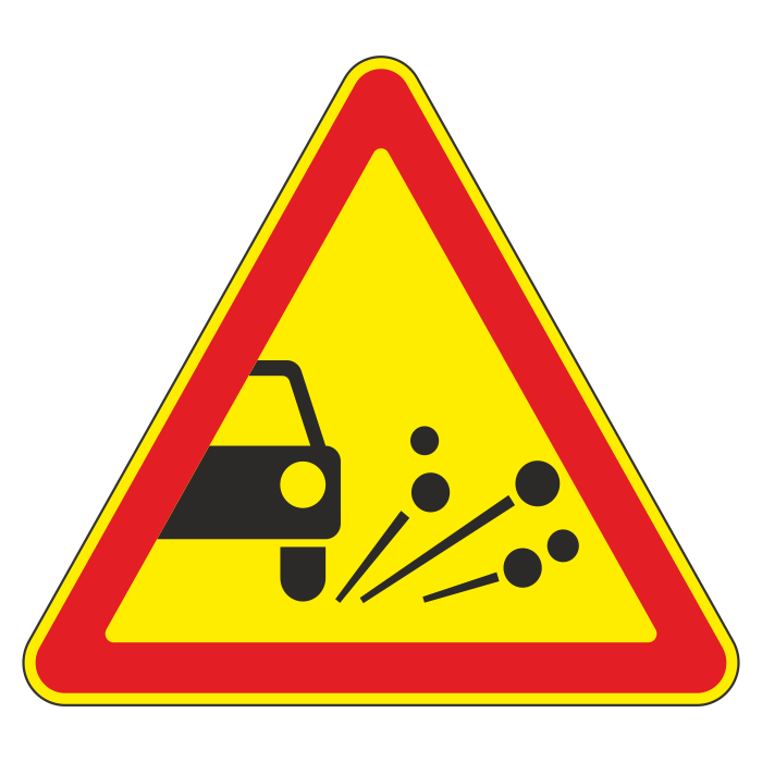 Дорожный знак 1.18 «Выброс гравия» (временный) (металл 0,8 мм, III типоразмер: сторона 1200 мм, С/О пленка: тип Б высокоинтенсивная) в Альметьевске купить