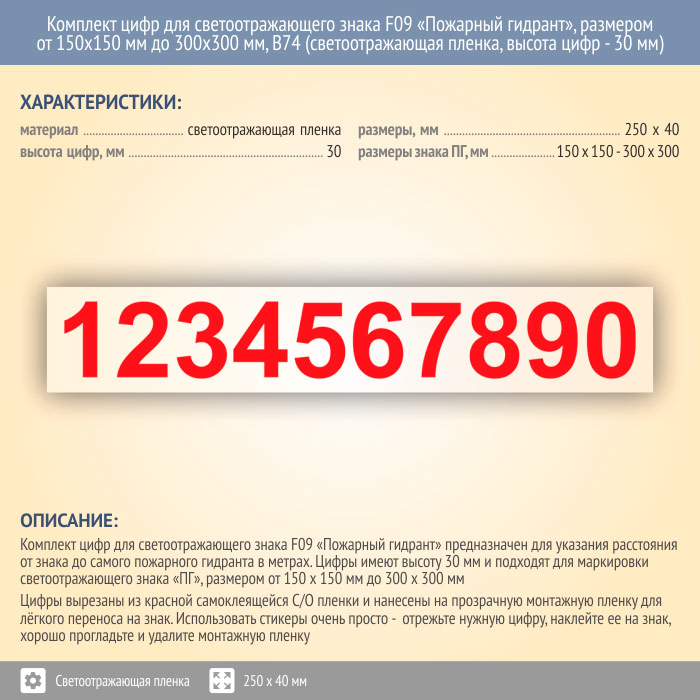 Комплект цифр для светоотражающего знака F09 «Пожарный гидрант», размером от 150х150 мм до 300х300 мм, В74 (светоотражающая пленка, 250х40 мм, высота цифр - 30 мм) в Альметьевске купить