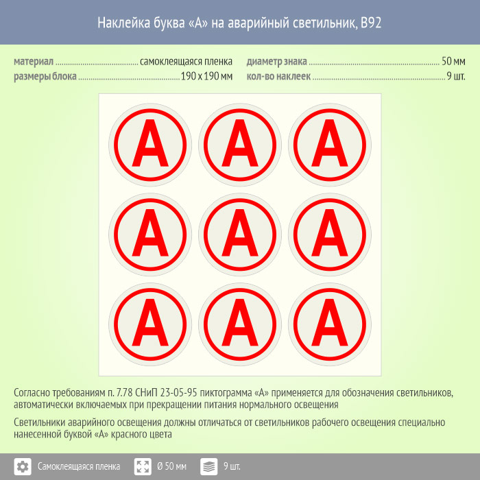 Наклейка буква «А» на аварийный светильник, B92 (пленка, диаметр 50 мм, блок 9 штук, 190х190 мм) в Альметьевске купить