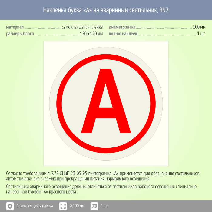 Наклейка буква «А» на аварийный светильник, B92 (пленка, диаметр 100 мм, 120х120 мм) в Альметьевске купить