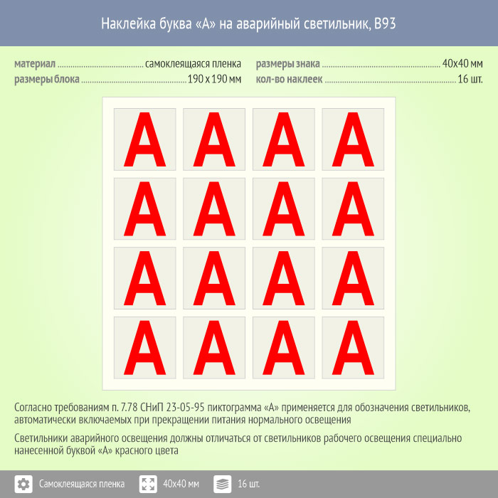 Наклейка буква «А» на аварийный светильник, B93 (пленка, 40х40 мм, блок 16 штук, 190х190 мм) в Альметьевске купить