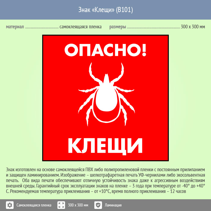 Знак «Опасно! Клещи», B101 (пленка c ламинированием, 300х300 мм) в Альметьевске купить