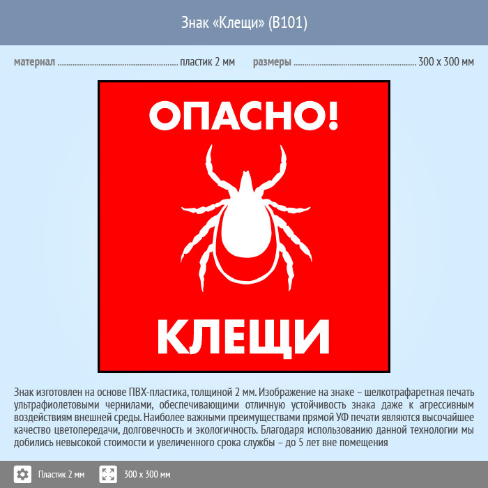 Знак «Опасно! Клещи», B101 (пластик, 300х300 мм) в Альметьевске купить