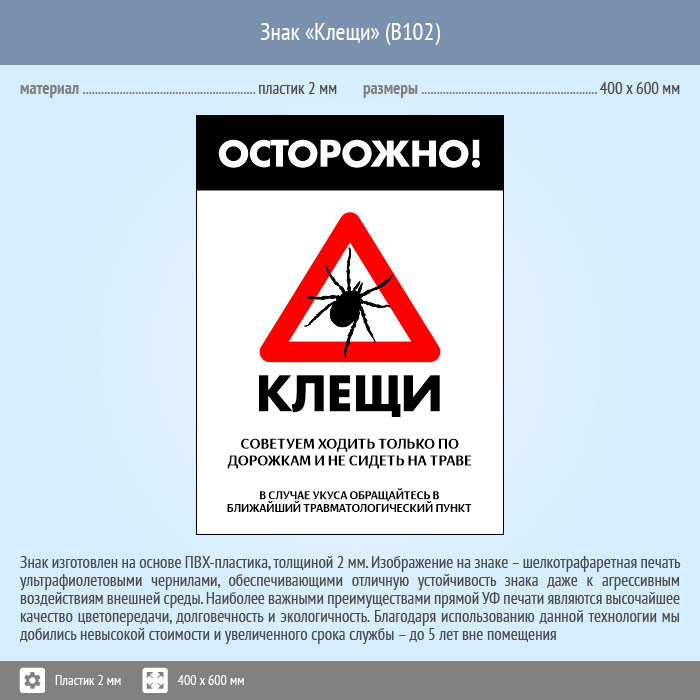 Знак «Осторожно! Клещи», B102 (пластик, 300х400 мм) в Альметьевске купить