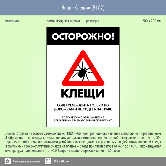 Знак «Осторожно! Клещи», B102 (пленка, 400х600 мм) в Альметьевске купить
