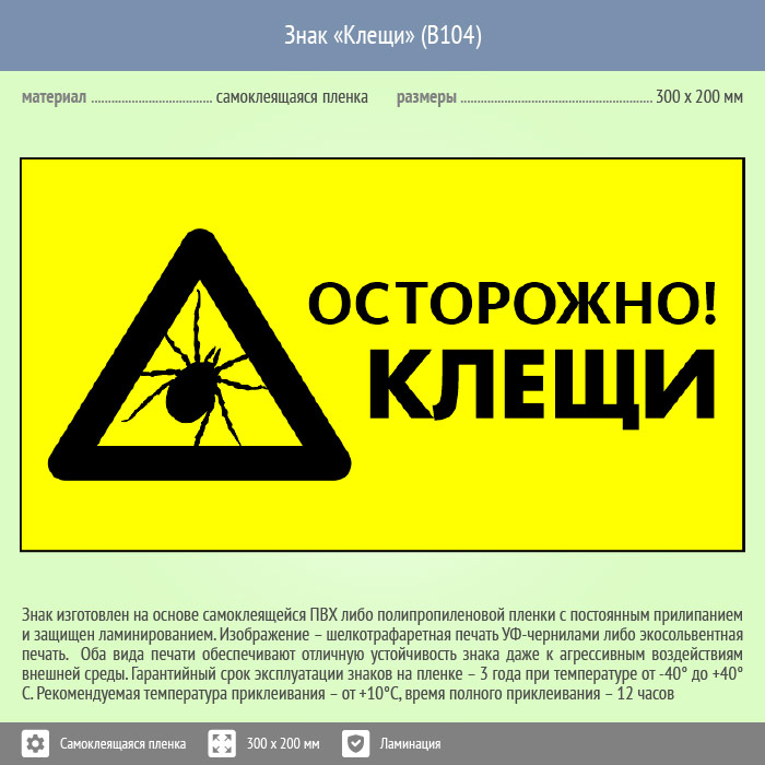 Знак «Осторожно! Клещи», B104 (пленка c ламинированием, 400х300 мм) в Альметьевске купить