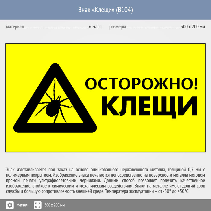 Знак «Осторожно! Клещи», B104 (металл, 400х300 мм) в Альметьевске купить