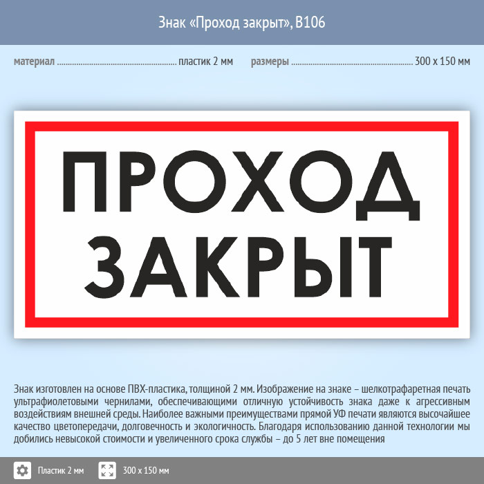 Знак «Проход закрыт», B106 (пластик, 300х150 мм) в Альметьевске купить