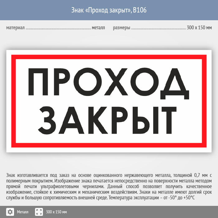Знак «Проход закрыт», B106 (металл, 300х150 мм) в Альметьевске купить