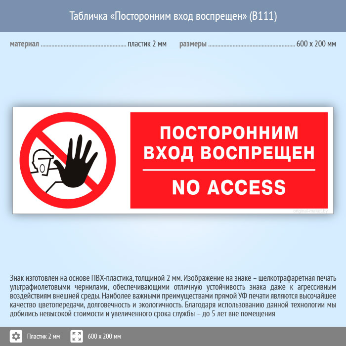 Табличка «Посторонним вход воспрещен», B111 (пластик, 600х200 мм) в Альметьевске купить