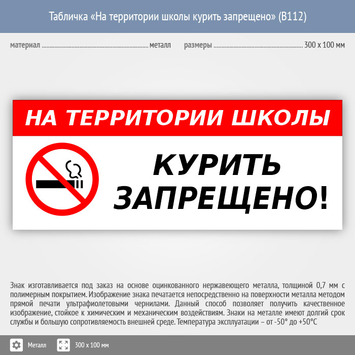 Табличка «На территории школы курить запрещено», B112 (металл, 300х100 мм) в Альметьевске купить