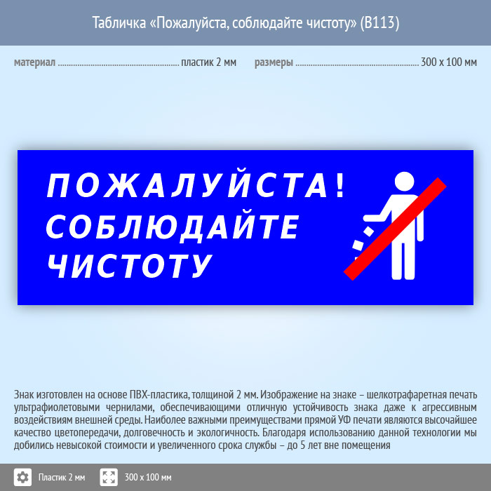 Табличка «Пожалуйста, соблюдайте чистоту», B113 (пластик, 300х100 мм) в Альметьевске купить