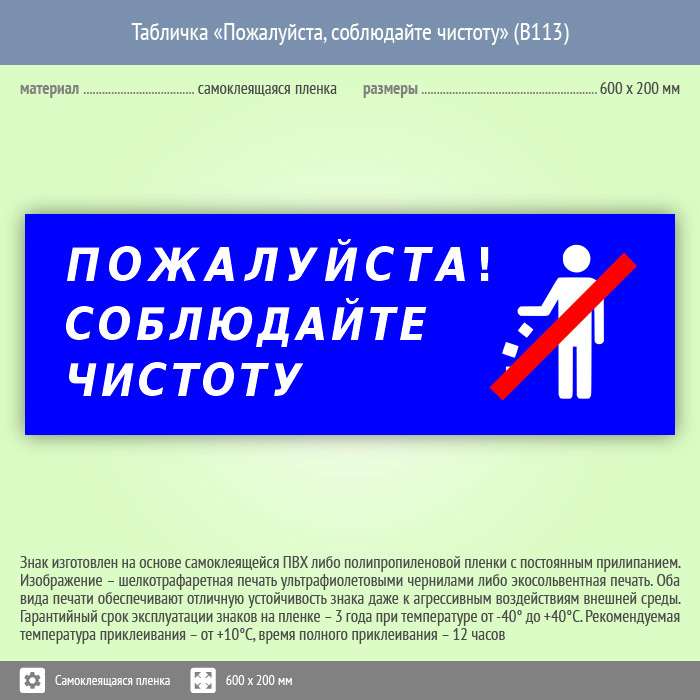 Табличка «Пожалуйста, соблюдайте чистоту», B113 (пленка, 600х200 мм) в Альметьевске купить