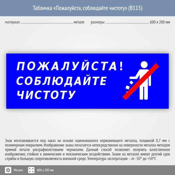 Табличка «Пожалуйста, соблюдайте чистоту», B113 (металл, 600х200 мм) в Альметьевске купить