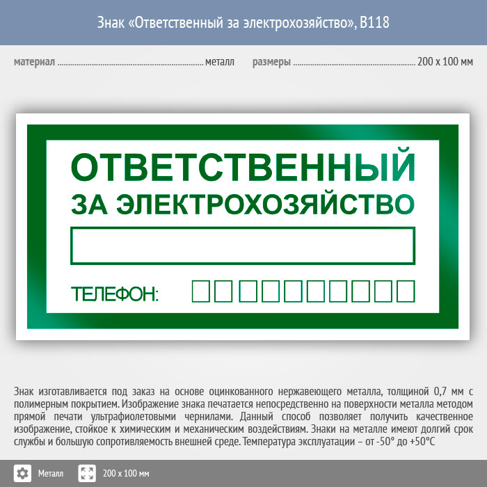 Знак «Ответственный за электрохозяйство», B118 (металл, 200х100 мм) в Альметьевске купить