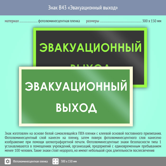 Знак B43 «Эвакуационный выход» (фотолюминесцентная пленка, 300х150 мм) в Альметьевске купить