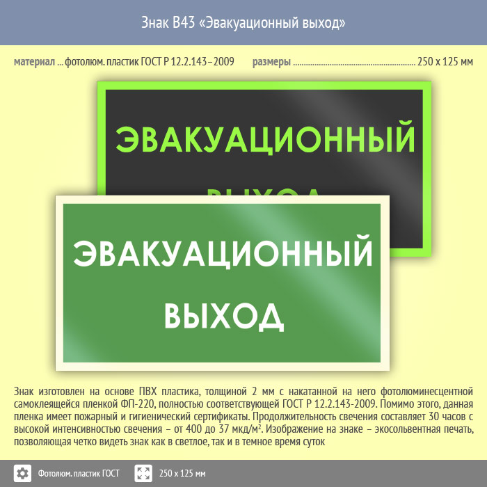 Знак B43 «Эвакуационный выход» (фотолюминесцентный пластик ГОСТ 34428-2018, 250х125 мм) в Альметьевске купить