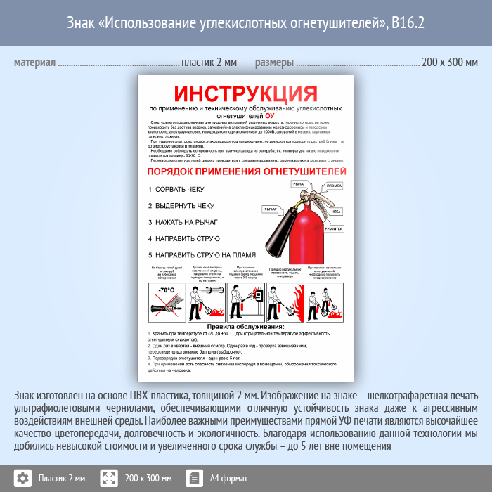 Знак «Использование углекислотных огнетушителей», B16.2 (пластик, 200х300 мм) в Альметьевске купить