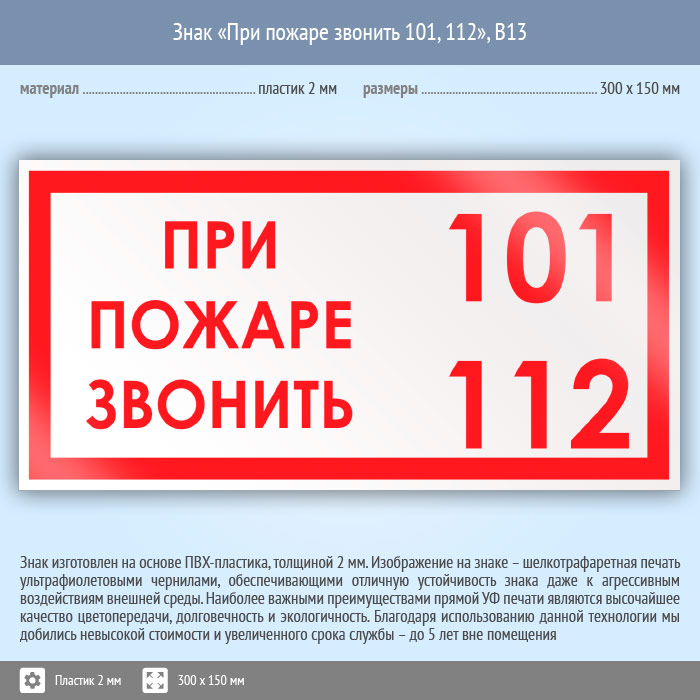 Знак «При пожаре звонить 101, 112», B13 (пластик, 300х150 мм) в Альметьевске купить