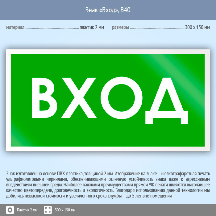 Знак «Вход», B40 (пластик, 300х150 мм) в Альметьевске купить