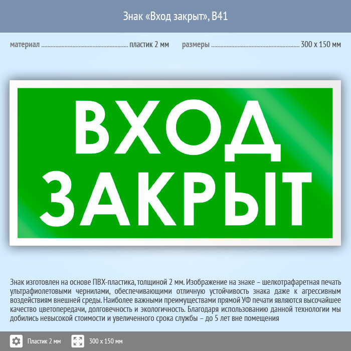 Знак «Вход закрыт», B41 (пластик, 300х150 мм) в Альметьевске купить