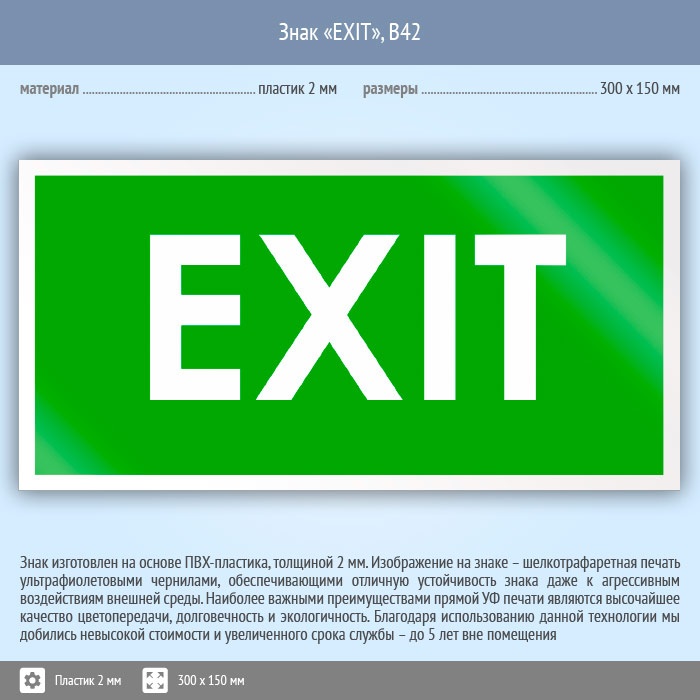 Знак «EXIT», B42 (пластик, 300х150 мм) в Альметьевске купить
