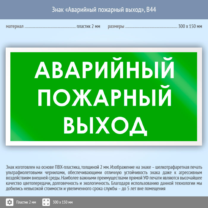 Знак «Аварийный пожарный выход», B44 (пластик, 300х150 мм) в Альметьевске купить