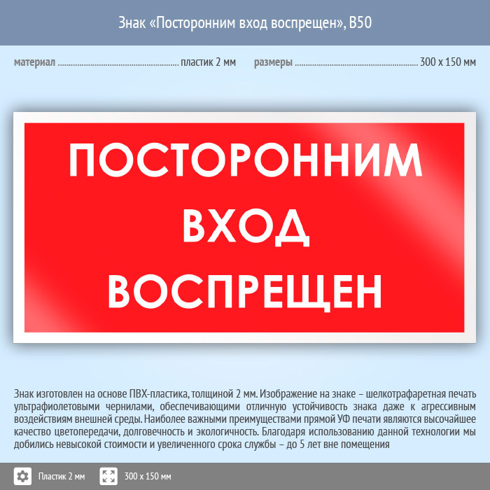Знак «Посторонним вход воспрещен», B50 (пластик, 300х150 мм) в Альметьевске купить