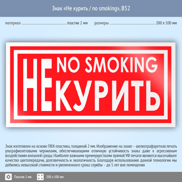 Знак «Не курить / no smoking», B52 (пластик, 200х100 мм) в Альметьевске купить