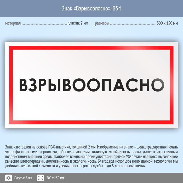 Знак «Взрывоопасно», B54 (пластик, 300х150 мм) в Альметьевске купить