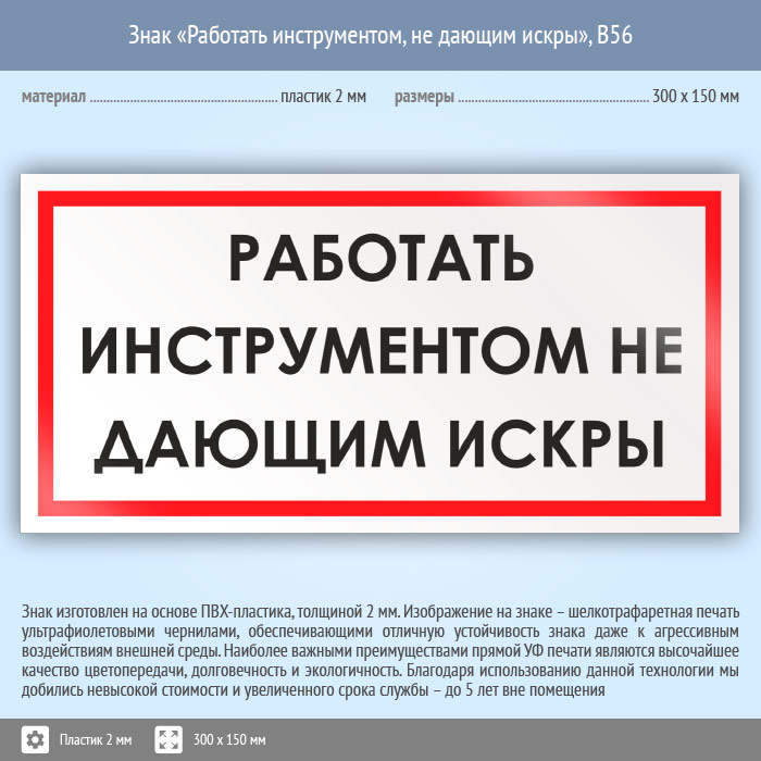 Знак «Работать инструментом, не дающим искры», B56 (пластик, 300х150 мм) в Альметьевске купить