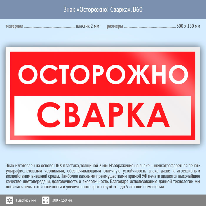 Знак «Осторожно! Сварка», B60 (пластик, 300х150 мм) в Альметьевске купить