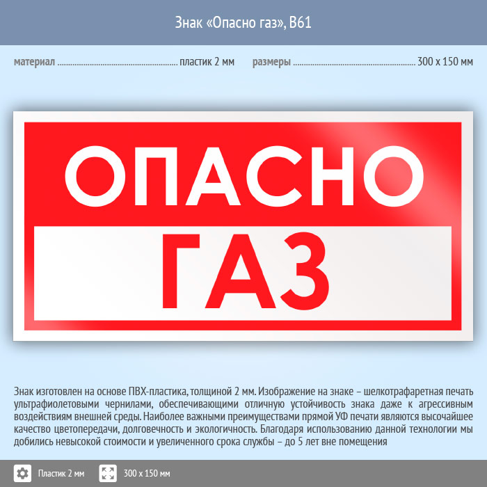 Знак «Опасно газ», B61 (пластик, 300х150 мм) в Альметьевске купить