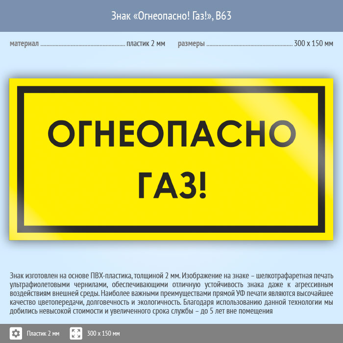 Знак «Огнеопасно! Газ!», B63 (пластик, 300х150 мм) в Альметьевске купить