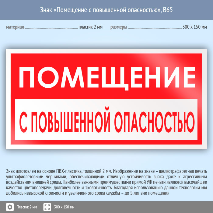 Знак «Помещение с повышенной опасностью», B65 (пластик, 300х150 мм) в Альметьевске купить