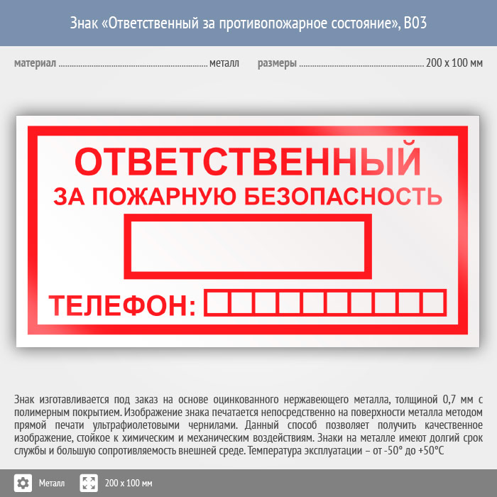 Знак «Ответственный за пожарную безопасность», B03 (металл, 200х100 мм) в Альметьевске купить